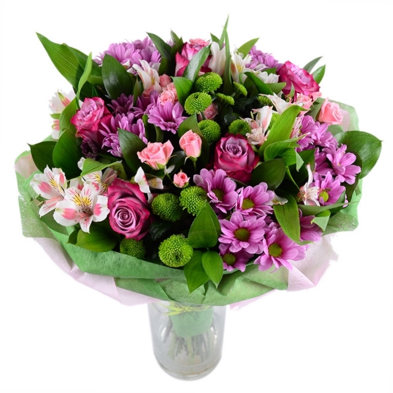 Bouquet «Pink dreams» is a gorgeous Women’s Day gift! Fresh pink roses and delicate chrysanthemums, complemented with traditional green, are truly wonderful and totally marvelous combination created for you to amaze even the most capricious lady.